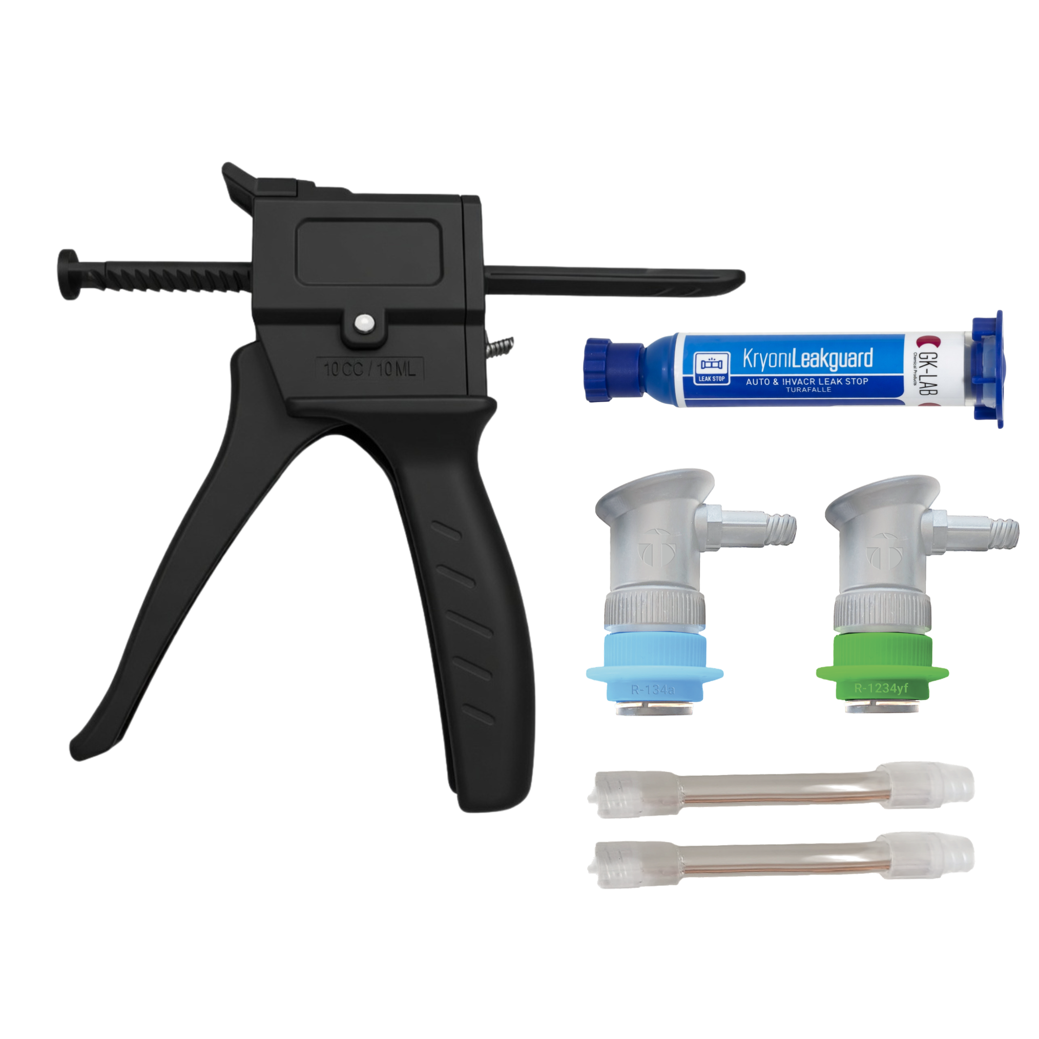 Comprend : 1 petite pistolet GK-Gun SMART pour utilisation avec cartouches de 8 ml, 2 raccords flexibles auto-étanches pour R134a et R1234yf, 1 cartouche de 8 ml de scellant KryonLeakGuard, le tout dans une valise en plastique.