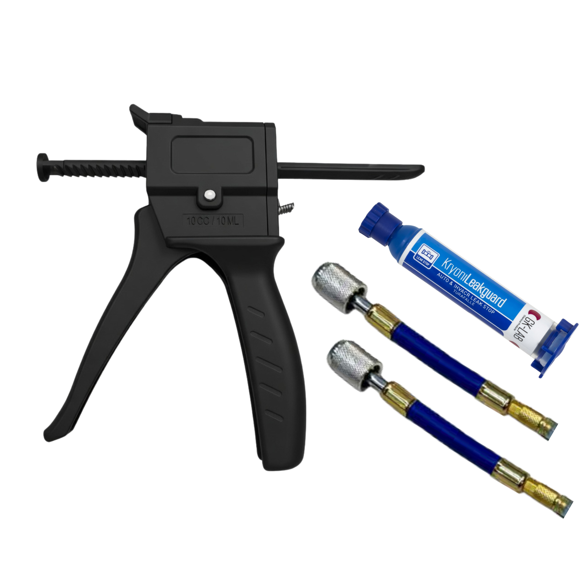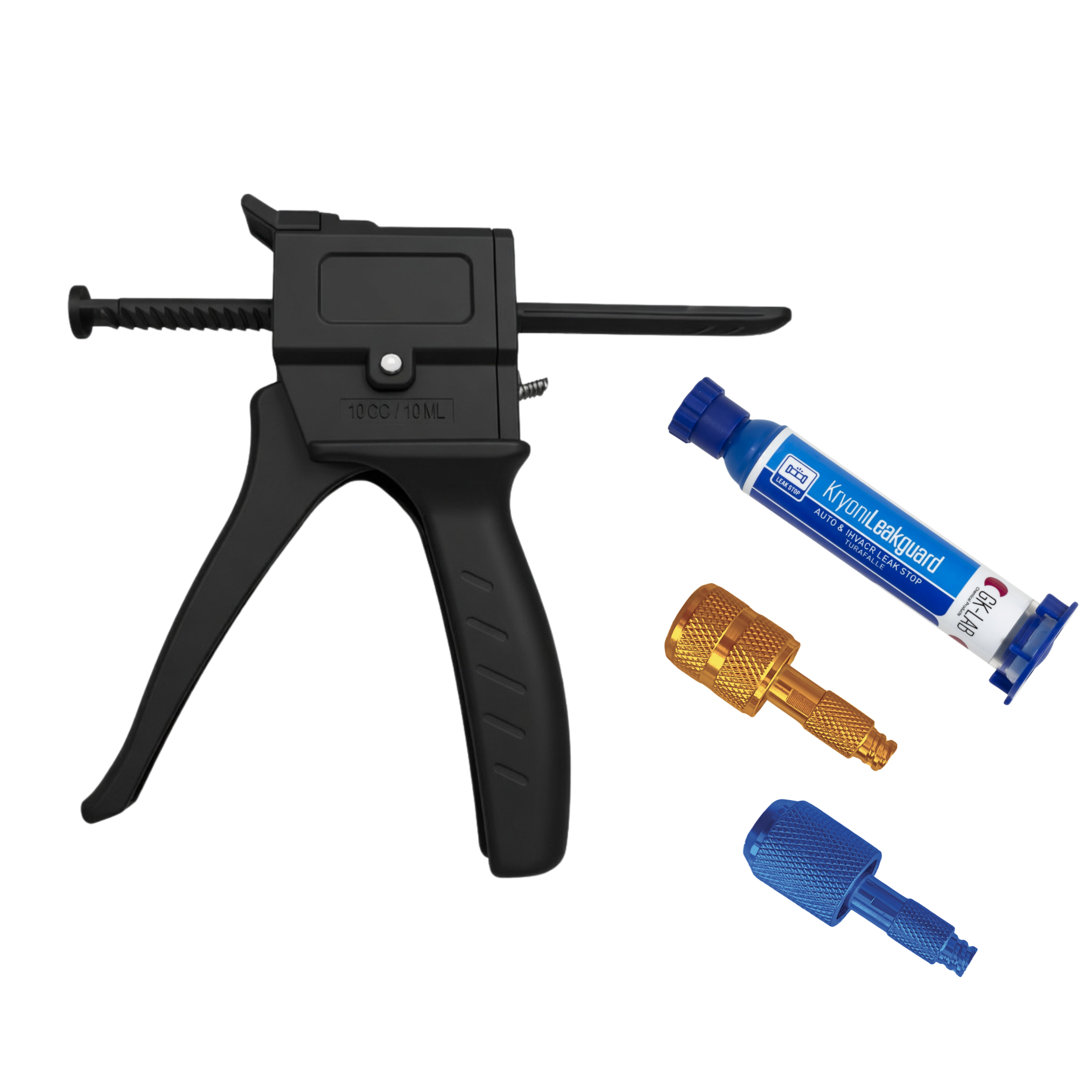 Comprend 1 pistolet GK-Gun PRO pour utilisation avec des cartouches de 8 ml, n° 2 raccords flexibles pour connexion à des systèmes avec raccords 1/4 et 5/16, et n° 1 cartouche de 48 ml de stop-fuite KryonLeakGuard.
