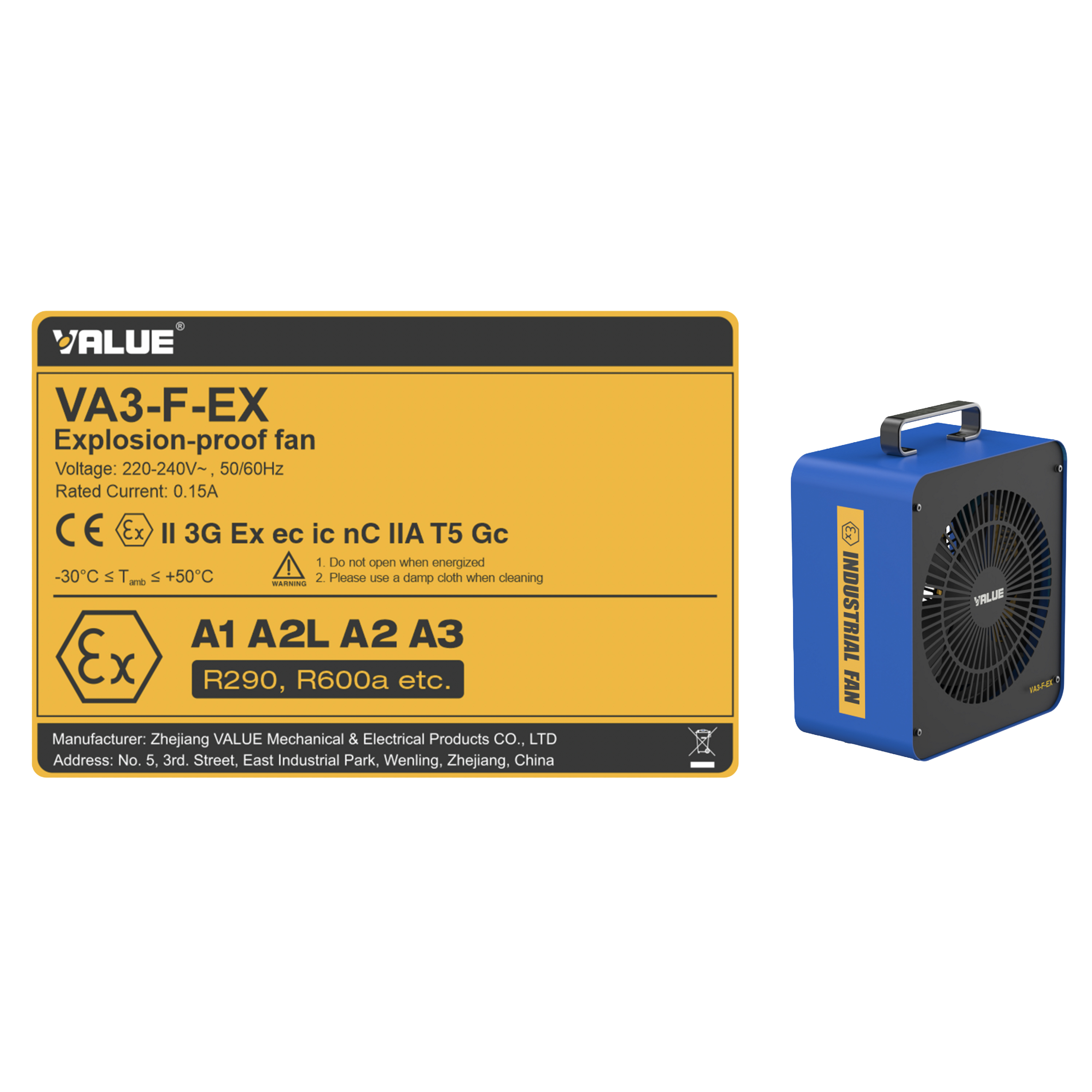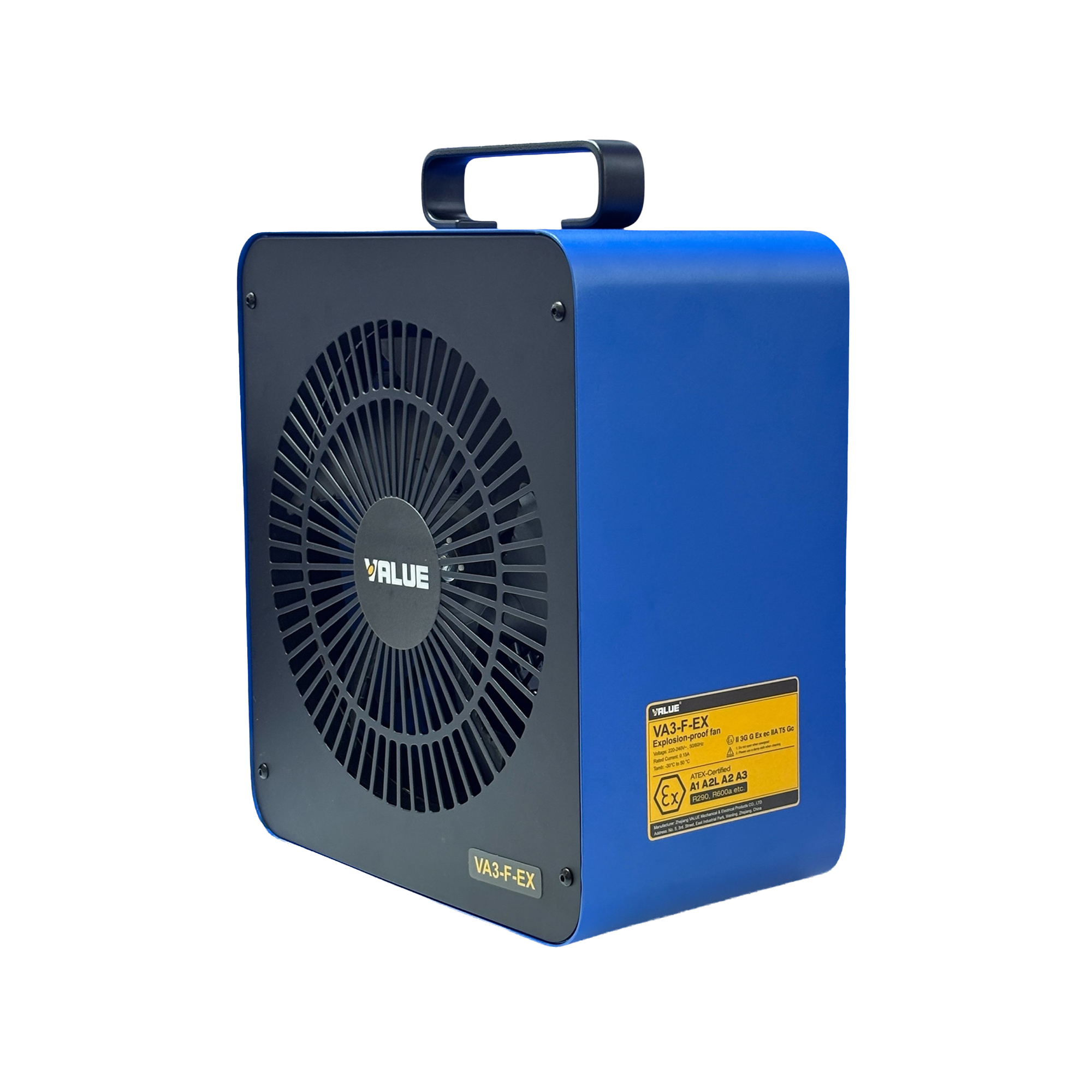 Le VA3-F-EX est un ventilateur industriel antidéflagrant certifié ATEX, développé par VALUE spécifiquement pour les applications de réfrigération et de climatisation utilisant des fluides frigorigènes inflammables de nouvelle génération. Compatible avec les réfrigérants de classe A3 (R290 propane, R600a isobutane), A2 et A2L, il garantit une ventilation rapide, sûre et sans étincelles dans tous les contextes opérationnels présentant un risque d'atmosphère explosive.